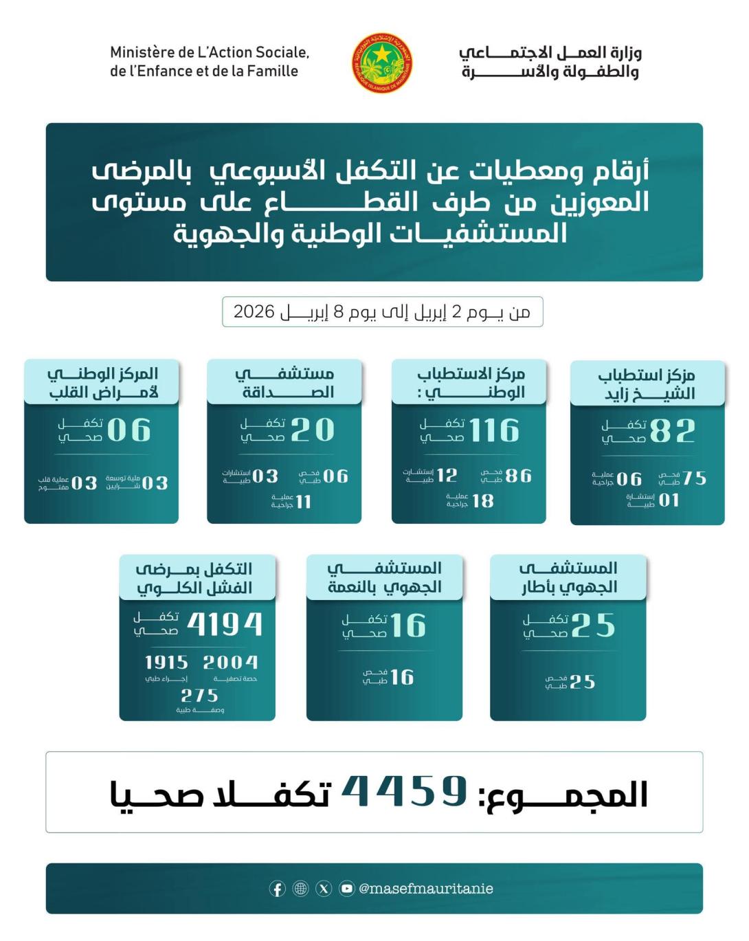 كشفت وزارة العمل الاجتماعي والطفولة والأسرة اليوم تحقيق 4459 كشف صحي خلال الفترة من 2 إلى 8 أبريل 2026.