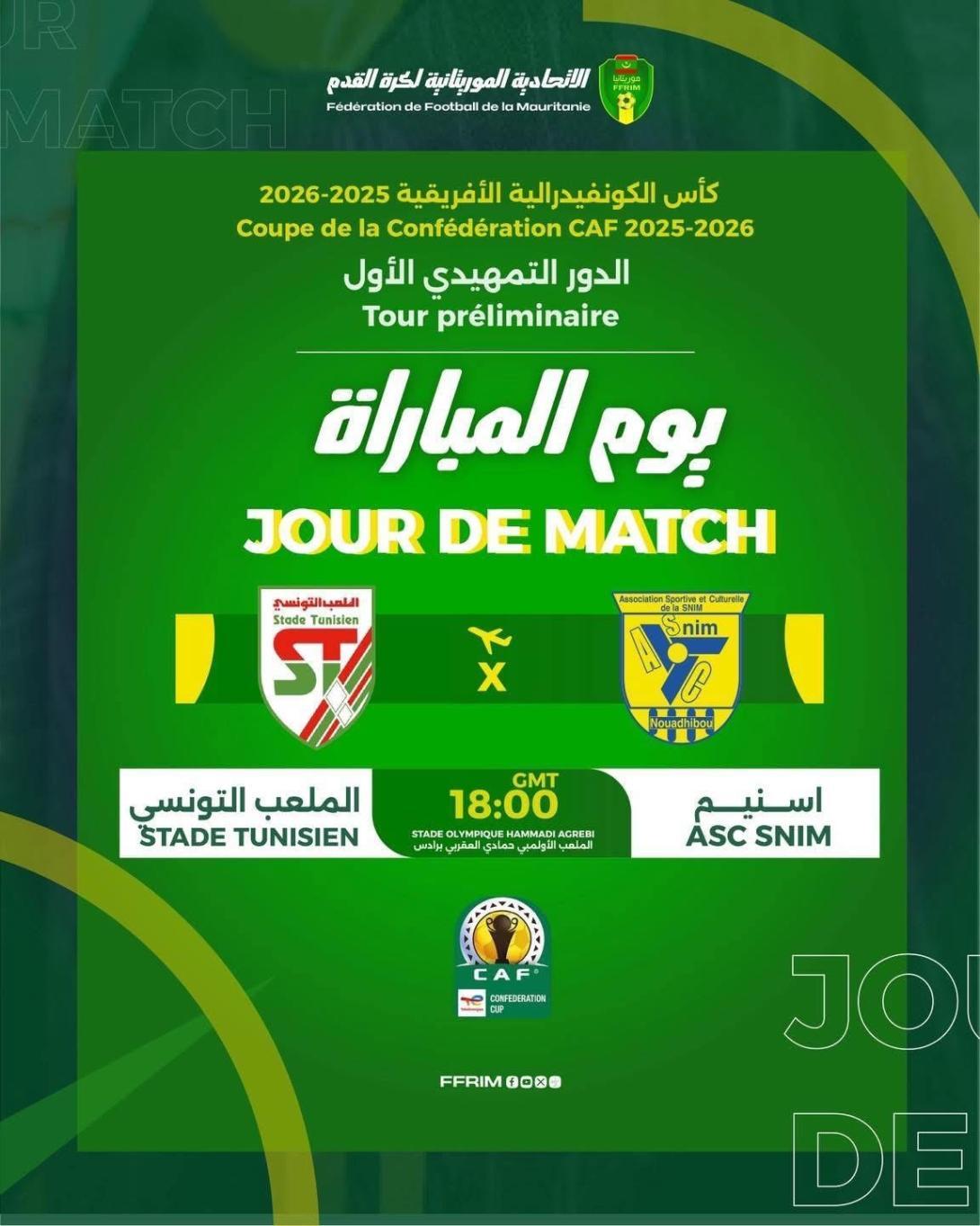 يلتقي نادي اسنيم مع الملعب التونسي اليوم السبت في ذهاب الدور التمهيدي الأول لكأس الكونفدرالية الأفريقية على أرضية الملعب الأولمبي حمادي العقربي برادس.