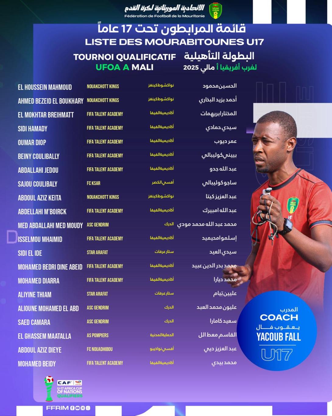 أعلن المدرب يعقوب افال عن قائمة المنتخب الوطني الموريتاني تحت 17 عامًا التي ستشارك في البطولة التأهيلية لاتحاد غرب إفريقيا "أ"، والتي ستقام في مالي.