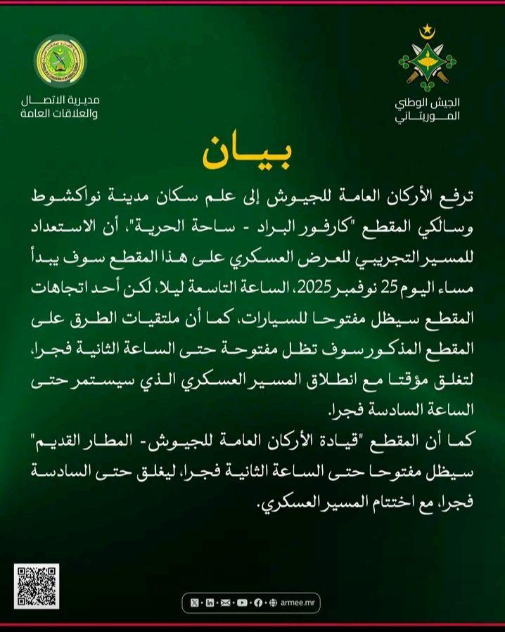 وأوضحت الأركان أن أحد اتجاهات المقطع سيظل مفتوحا, لحركة السيارات خلال فترة الاستعداد، فيما ستظل ملتقيات الطرق مفتوحة حتى الساعة الثانية فجرا، قبل أن تُغلق مؤقتا مع انطلاق المسير العسكري، المتوقع أن يستمر حتى الساعة السادسة فجرا.