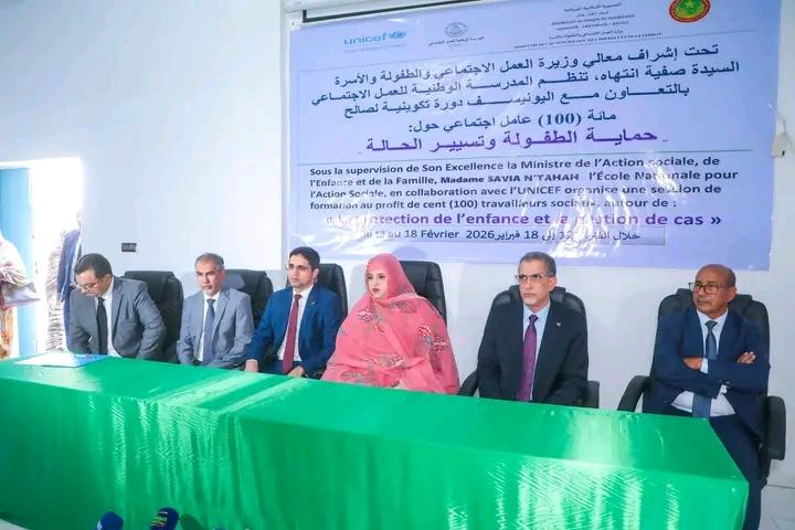 أشرفت وزيرة العمل الاجتماعي والطفولة والأسرة، صفية انتهاه، اليوم الخميس، رفقة وزير تمكين الشباب والرياضة والخدمة المدنية محمد عبد الله ولد لولي، ووالي نواكشوط الغربية حمود ولد امحمد، على افتتاح دورة تكوينية بالمدرسة الوطنية للعمل الاجتماعي في نواكشوط، موجهة لصالح 100 عامل اجتماعي حول حماية الطفولة وتسيير الحالة.