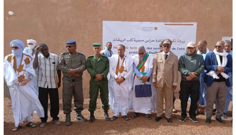 أشرف المكلف بمهمة بوزارة البيئة والتنمية المستدامة، السيد أحمد ولد الزين، منسق مشروع التسيير المندمج للمحميات في المناطق الجافة بموريتانيا (أمبادرا)، صحبة حاكم المقاطعة، السيد الطالب أحمد محمد الأمين أمس الإثنين في مدينة وادان، ، على افتتاح ورشة تكوينية لصالح 12 حارسا لمحمية كلب الريشات.