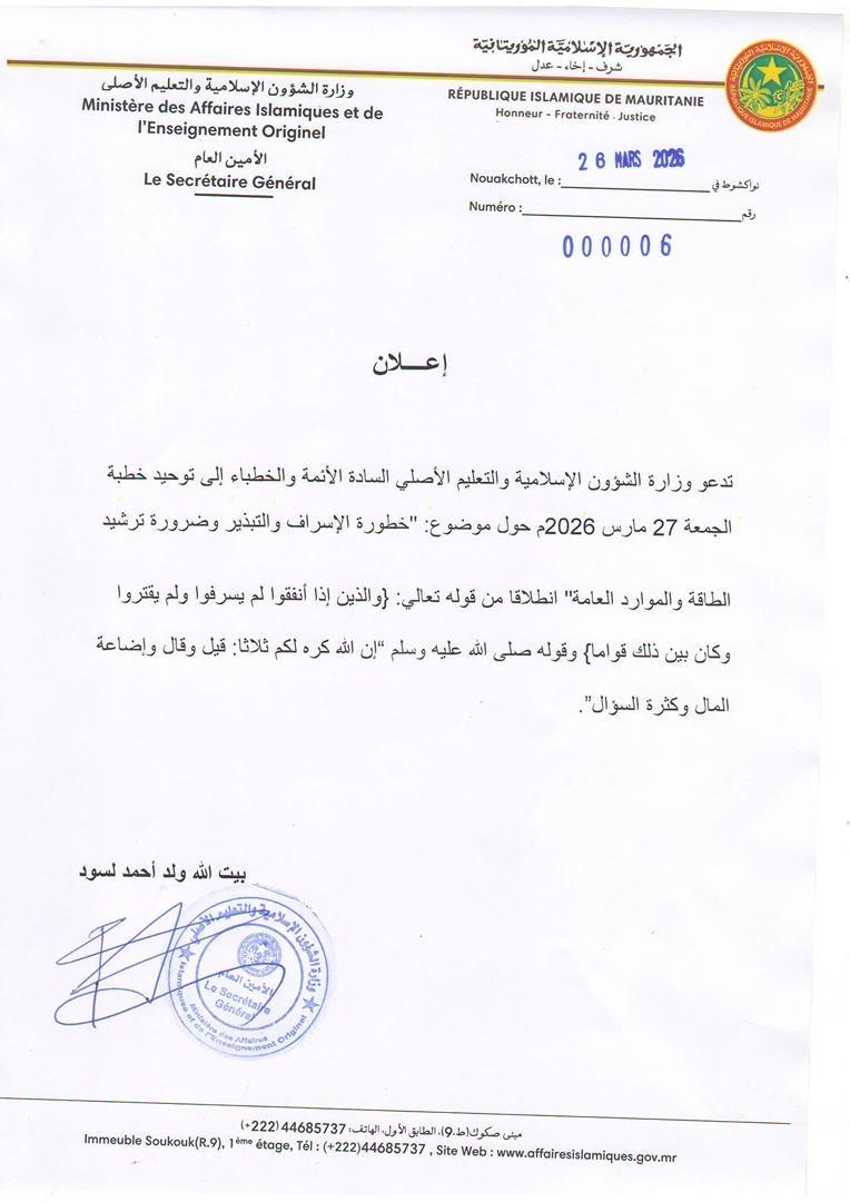 وأصدرت الوزارة إعلانا موقعا من طرف الأمين العام للوزارة بيت الله ولد أحمد لسود يحث الأئمة على ضرورة تناول الموضوع في خطبة الجمعة.
