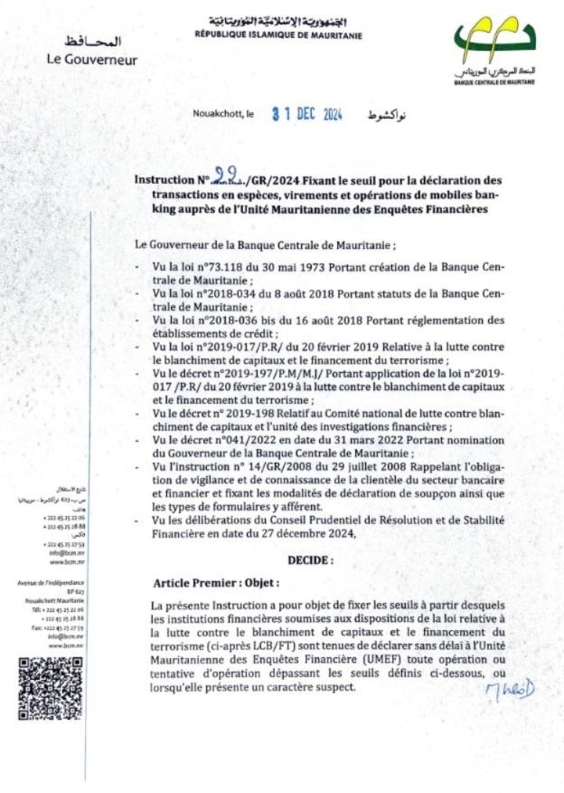 أصدر البنك المركزي الموريتاني قرارا أبلغ من خلاله المؤسسات المالية والكيانات الأخرى الخاضعة للنظم، أن "أي معاملة نقدية" إيداعا كانت أو سحبا تساوي أو تزيد على 10 ملايين أوقية قديمة يجب أن تكون موضوع شبهة، "إذا لم تكن مبررة بالوثائق المناسبة".