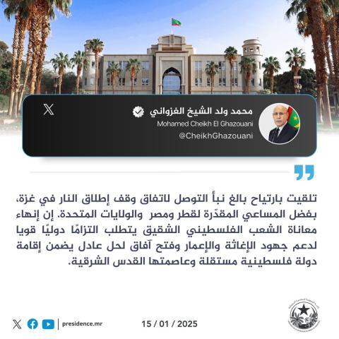 أعرب رئيس الجمهورية محمد ولد الشيخ الغزواني، عن بالغ إرتياحه لخبر التوصل إلى إتفاق إطلاق النار في غزة .