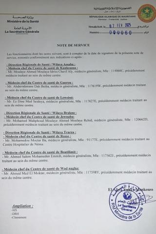 وتضمنت المذكرة تعيين رؤساء لمراكز صحية أخرى في جونابه، بولاية لبراكنه وروصو، وواد الناقة، وبوتلميت، بولاية اترارزة.