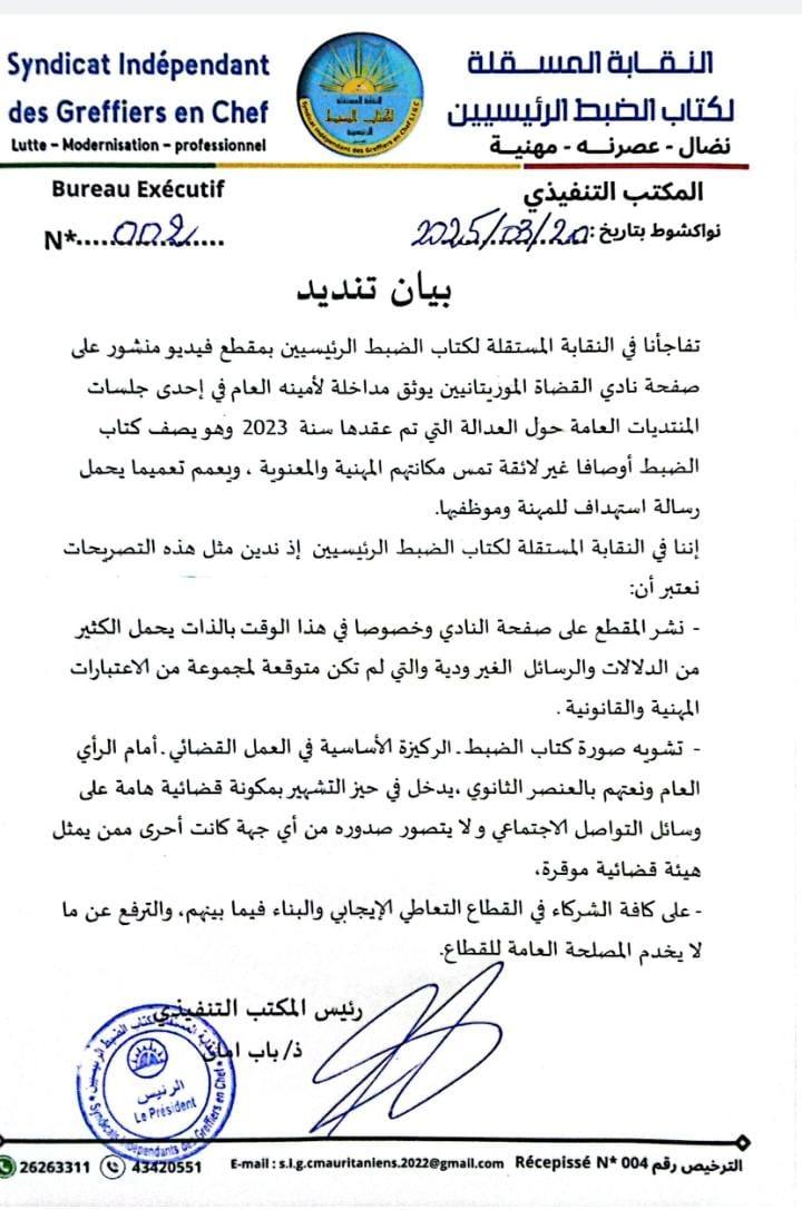 أعربت نقابة كتاب الضبط الرئيسيين عن استيائها من مقطع فيديو نُشر على صفحة نادي القضاة الموريتانيين، يظهر مداخلة للأمين العام للنادي خلال إحدى جلسات المنتديات العامة حول العدالة سنة 2023.