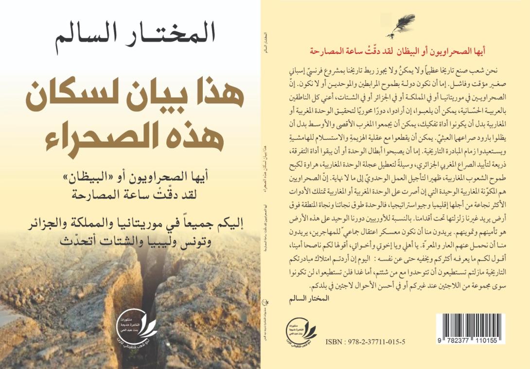 صدر كتاب "هذا بيان لسكان هذه الصحراء" للشاعر والروائي المختار السالم، وهو أول كتاب سياسي للمؤلف، الذي أصدر أكثر من عشرين كتابا أدبيا في الشعر والسرد.