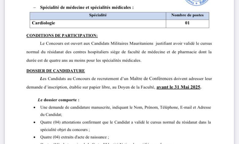 وورد في إعلان المسابقة المنشور عبر البوابة العمومية المغربية للتشغيل (رسمية)، أن “المسابقة مفتوحة للمرشحين العسكريين الموريتانيين الذين يمكنهم إثبات أنهم أكملوا دورة الإقامة العادية في المستشفيات التي تستضيف كليات الطب والصيدلة”.
