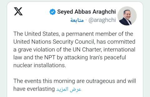 عراقجي، عبر حسابه على منصة «إكس»: «ارتكبت الولايات المتحدة، العضو الدائم في مجلس الأمن الدولي، انتهاكاً خطيراً لميثاق الأمم المتحدة، والقانون الدولي، ومعاهدة حظر الانتشار النووي، عبر مهاجمة المنشآت السلمية النووية» للجمهورية الإسلامية.