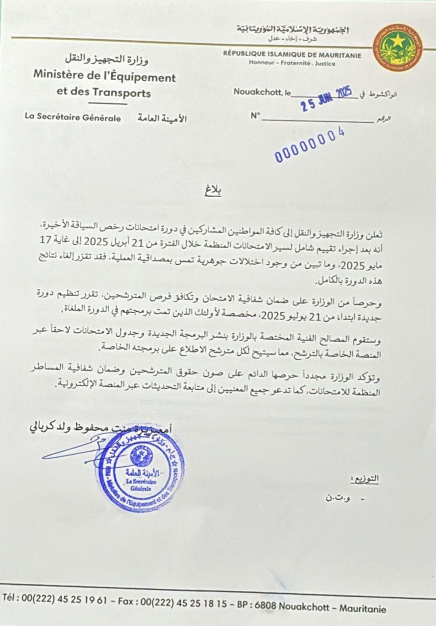 أعلنت وزارة التجهيز والنقل، إلغاء نتائج امتحانات رخص السياقة المنظمة خلال الفترة من 21 أبريل إلى 17 مايو 2025.