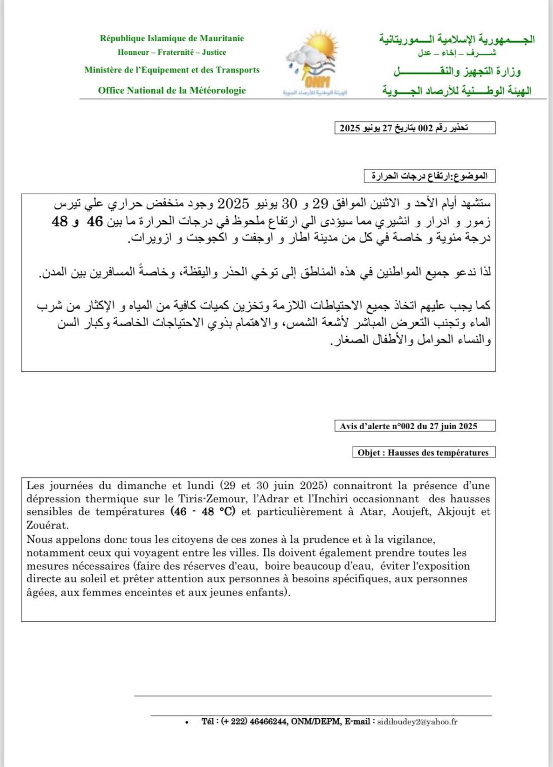 توقعت الهيئة الوطنية للأرصاد الجوية أن تشهد أيام الأحد والاثنين 29 و 30 يونيو وجود منخفض حراري على تيرس زمور وآدرار وإينشري، سيؤدي إلى ارتفاع درجات الحرارة.