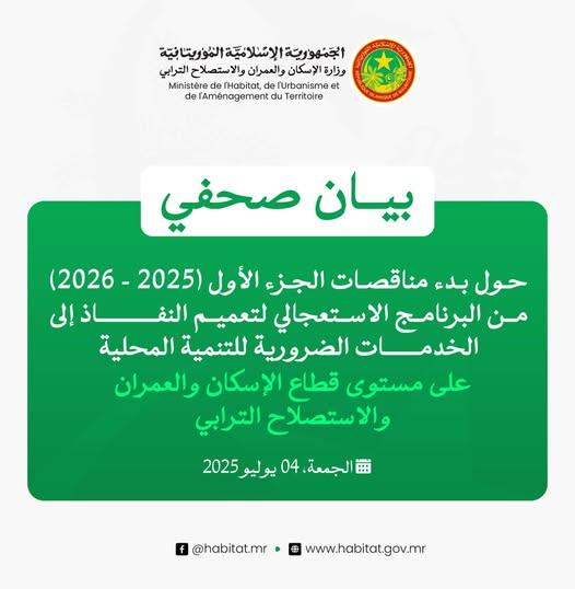 تعلن وزارة الإسكان والعمران والاستصلاح الترابي عن بدء مناقصات لإنجاز مشاريع صحية وتعليمية؛ مدرجة ضمن الجزء الأول (2025 – 2026) من البرنامج الاستعجالي لتعميم النفاذ إلى الخدمات الضرورية للتنمية المحلية، تنفيذًا لبرنامج فخامة رئيس الجمهورية السيد محمد ولد الشيخ الغزواني "طموحي للوطن"، في ظل متابعة خاصة من طرف معالي الوزير الأول السيد المختار ولد أجاي.