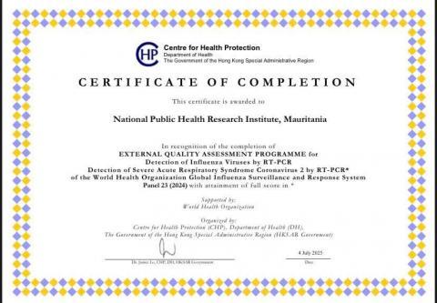 حصل المعهد الوطني للبحوث في مجال الصحة العمومية على شهادة إتمام دولية في جودة التشخيص المخبري من مركز الحماية الصحية التابع لحكومة منطقة هونغ كونغ.