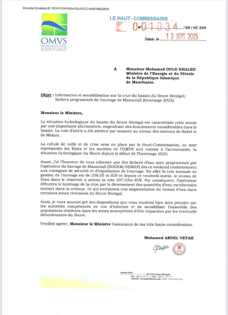 حذرت منظمة استثمار نهر السنغال من فيضانات في المناطق الشاطئية جراء وصول المياه في سد "منانتالي" لأقصى طاقته.