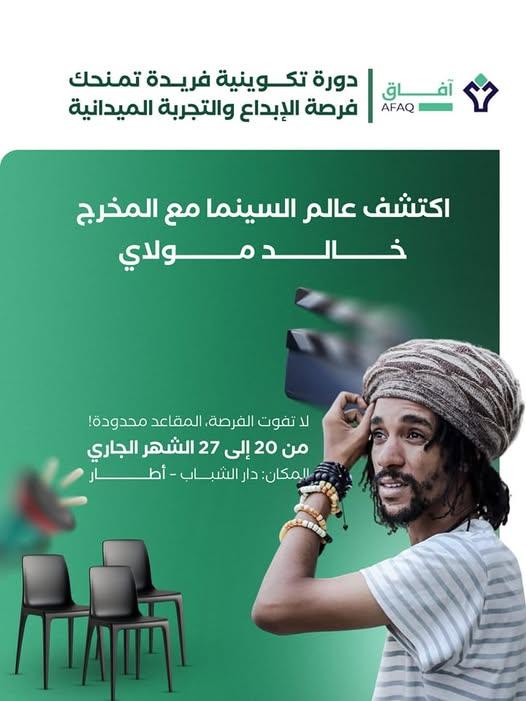 منظمة آفاق للثقافة والفنون تقدم لكم دورة تكوينية فريدة من نوعها مع المخرج خالد مولاي، فرصة لا تعوّض لاكتشاف عالم السينما من الداخل، والتعرف على أسرار التصوير، المونتاج، وكتابة السيناريو.