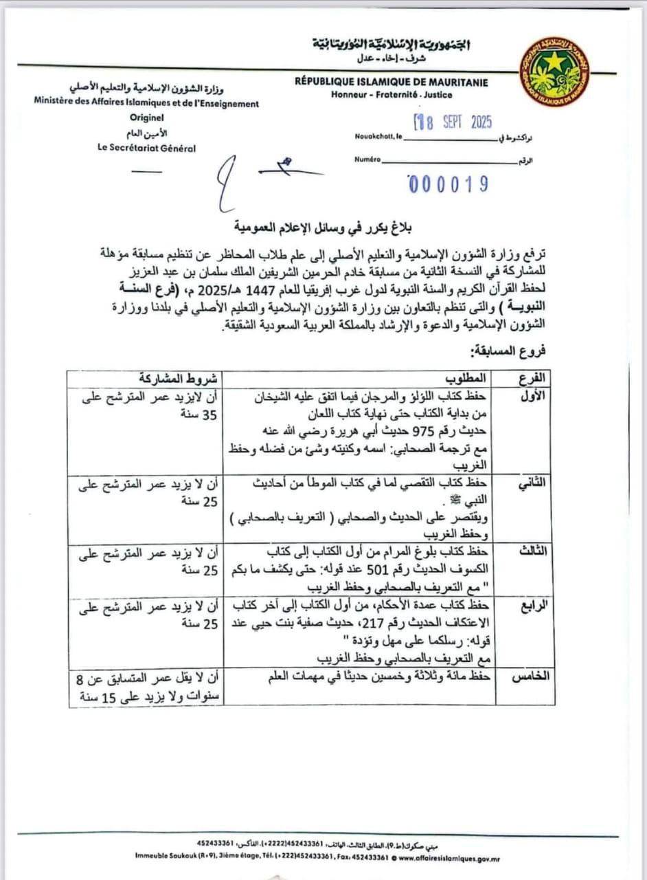 أعلنت وزارة الشؤون الإسلامية والتعليم الأصلي عن تنظيم مسابقة مؤهلة للمشاركة في النسخة الثانية من مسابقة الملك سلمان بن عبدالعزيز لحفظ القرآن الكريم والسنة النبوية لدول غرب إفريقيا بالتعاون مع وزارة الشؤون الإسلامية والدعوة والإرشاد بالسعودية.