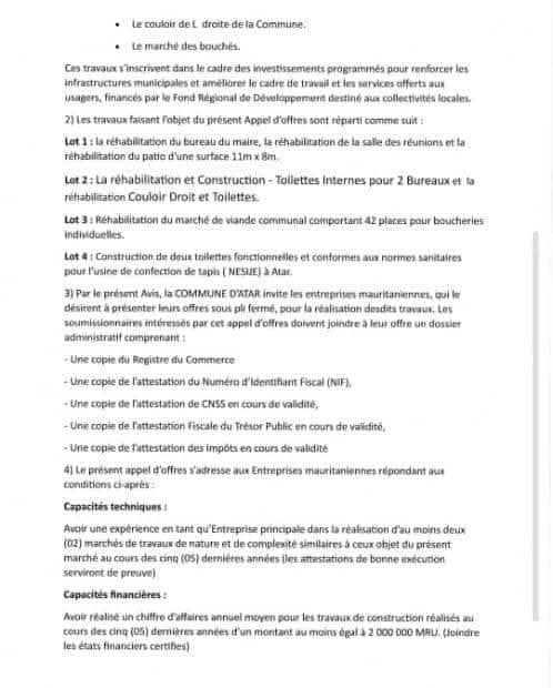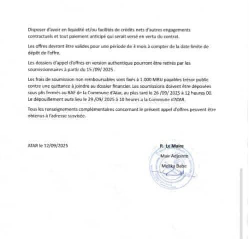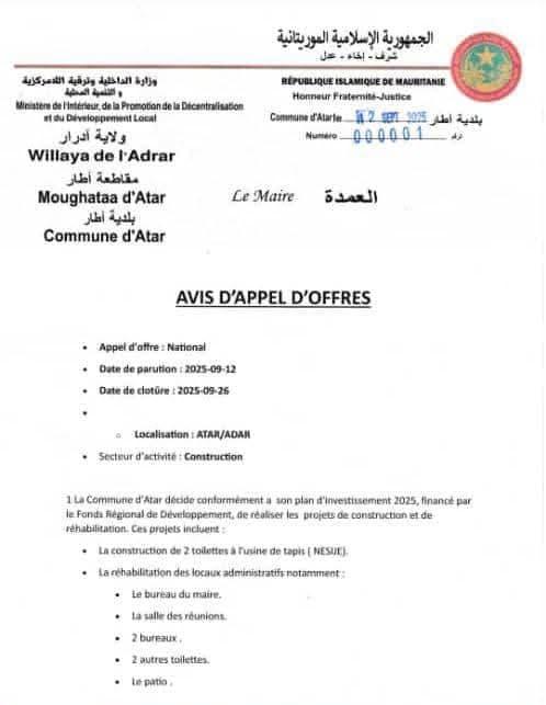 تُذكّر بلدية أطار السادة المتابعين الكرام بقرب انتهاء آجال التقديم في المناقصة المتعلقة بترميم بعض المرافق داخل مبنى البلدية، والتي تم الإعلان عنها سابقًا.