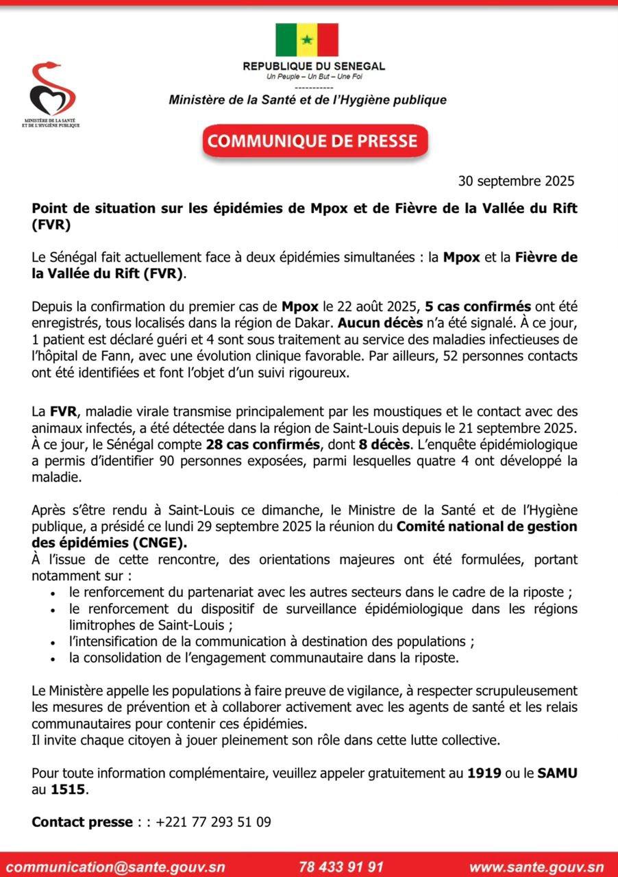 وأوضح البيان أنه بخصوص حمى الوادي المتصدع، تم منذ 21 سبتمبر 2025 تسجيل 28 حالة إصابة مؤكدة في سان لوي، بينها 8 وفيات، كما تم تحديد 90 شخصا تظهر عليهم الأعراض "تطورت الإصابة لدى 4 منهم".