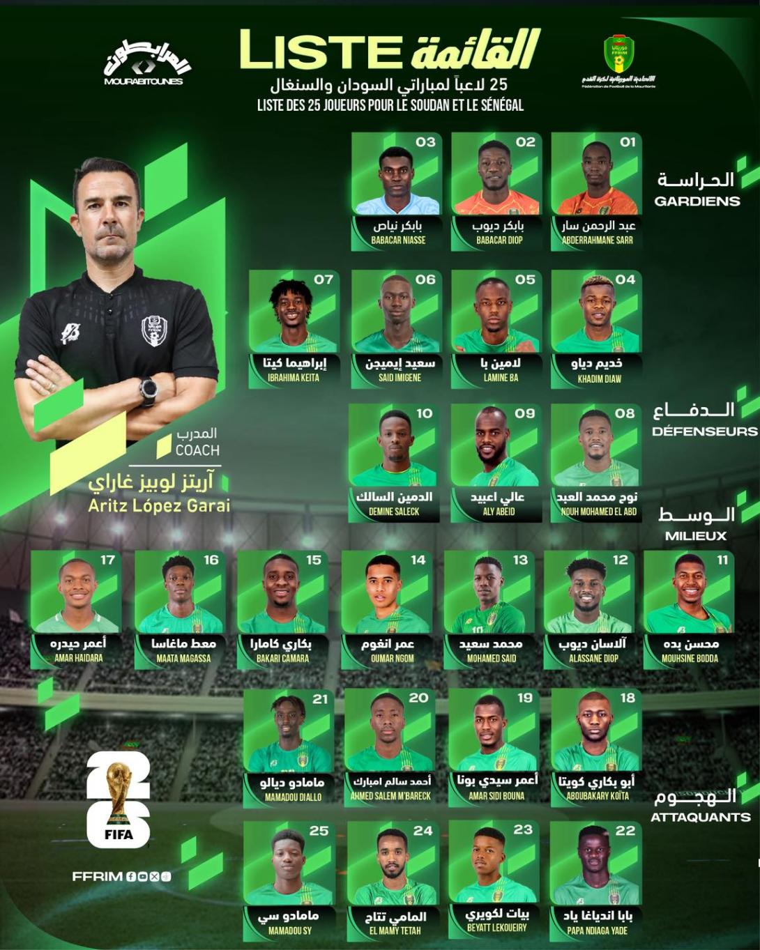 أعلن مدرب المنتخب الوطني (المرابطون) أريـتـز لـوبـيـز غـاراي، قائمة لاعبيه لمواجهة السودان والسنغال لحساب الجولتين التاسعة والعاشرة من تصفيات كأس العالم 2026.
