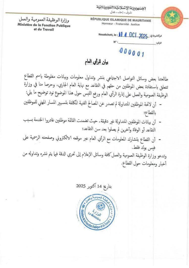 نفت وزارة الوظيفة العمومية والعمل صحة قائمة متداولة على وسائل التواصل الاجتماعي قيل إنها تخص الموظفين المحالين إلى التقاعد نهاية 2025، مؤكدة أن القائمة غير صادرة عن الجهات الرسمية وأنها تضمنت أخطاءً جوهرية، منها إدراج أسماء موظفين لا يزالون على رأس عملهم.