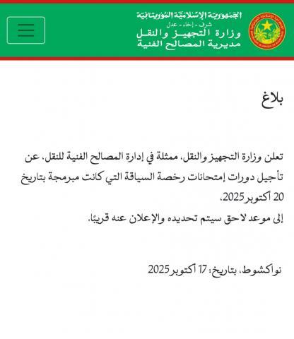 أعلنت وزارة التجهيز والنقل، ممثلة في إدارة المصالح الفنية للنقل، عن تأجيل دورات امتحانات رخصة السياقة التي كانت مبرمجة بتاريخ 20 أكتوبر 2025، إلى موعد لاحق سيتم تحديده والإعلان عنه قريبًا.