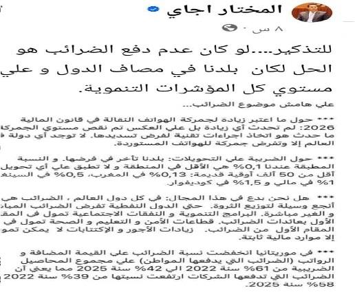 انتقد الوزير الأول المختار ولد اجاي، ضمنيا الجدل المثار بشأن القرار المتعلقة بجمركة الهواتف والضريبة على التحويلات في ميزانية 2026.