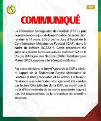 نددت الاتحادية السنغالية لكرة القدم مساء الثلاثاء بالقرار الصادر عن لجنة استئناف العقوبات التابعة للاتحاد الإفريقي لكرة القدم، والذي يقضي بتجريد السنغال من كأس الأمم الإفريقية الأخيرة لصالح المغرب، معتبرة إياه "مجحفا وغير مسبوق وغير مقبول".
