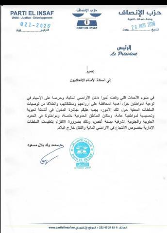 طالب حزب الإنصاف الحاكم أمناء اتحادياته إلى التعبئة والتحسيس وحث المواطنين على الالتزام بتعليمات السلطات بخصوص منع الانتجاع داخل أراضي مالي.