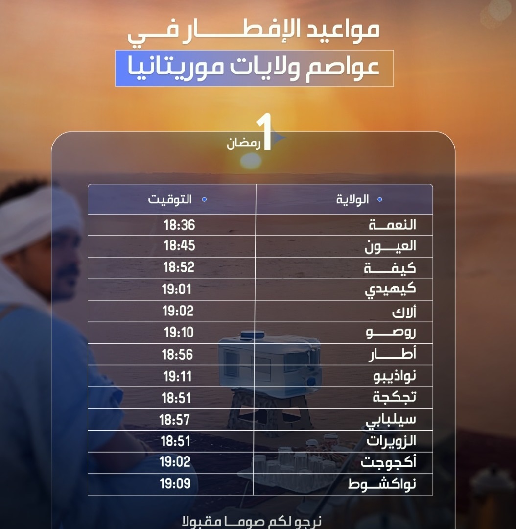 أوقات إفطار الخميس فاتح رمضان في عموم موريتانيا