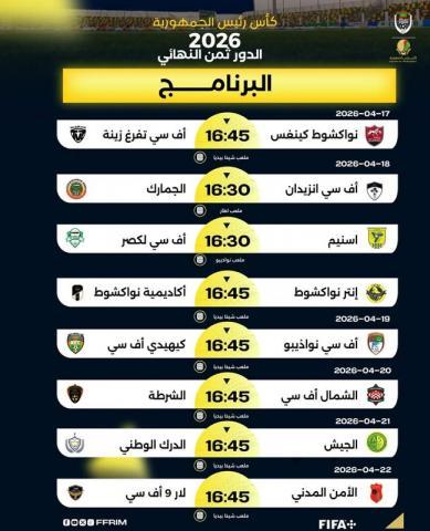 تفتتح اليوم مباريات دور 16 من كأس رئيس الجمهورية بمواجهة تجمع بين نواكشوط كينغ وتفرغ زينة على ملعب شيخا بيديا .