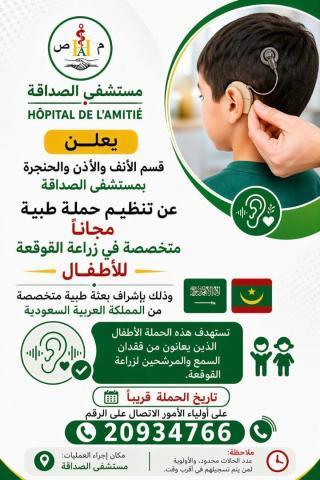 أعلن قسم الأنف والأذن والحنجرة بمستشفى الصداقة بولاية نواكشوط الجنوبية، بالتعاون مع بعثة طبية سعودية، عن تنظيم حملة طبية مجانية لزراعة القوقعة، تستهدف الأطفال الذين يعانون من الصمم الشديد إلى العميق.