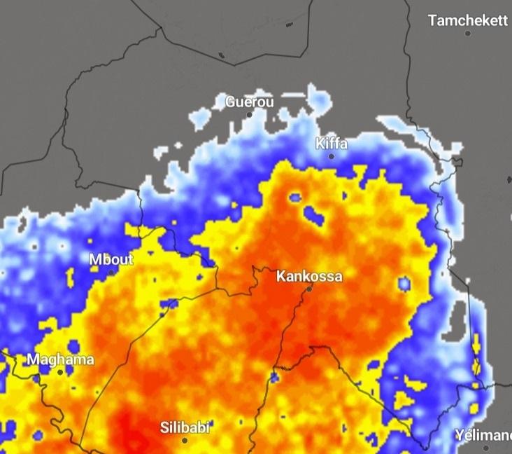 وبالتزامن مع انتشار هذه السحب الماطرة شمال الحوض الغربي، تغطي سحب ماطرة أخرى الآن (08:55 دقيقة) كامل ولايتي كيدي ماغا وكوركل، وجلّ العصابة، وشمال الحوض الغربي، وجنوب شرق تكانت.