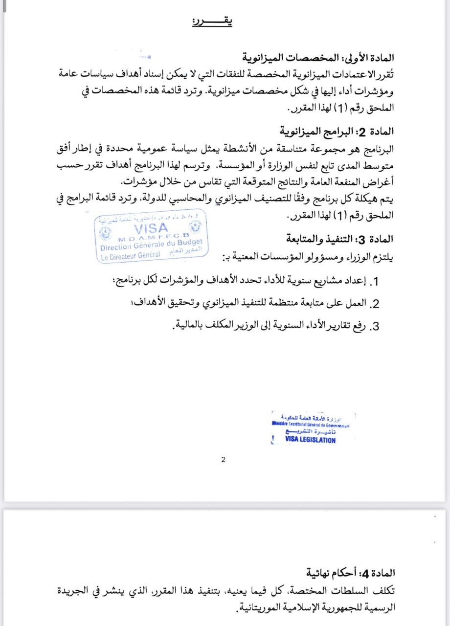 أصدر وزير الاقتصاد والمالية سيدي أحمد ابوه مقرّرا يُلزمُ في مادته الثالثة الوزراء بإعداد مشاريع سنوية للأداء تحدد الأهداف والمؤشرات لكل برنامج، وتعمل على متابعة منتظمة للتنفيذ الميزانوي وتحقيق الأهداف.