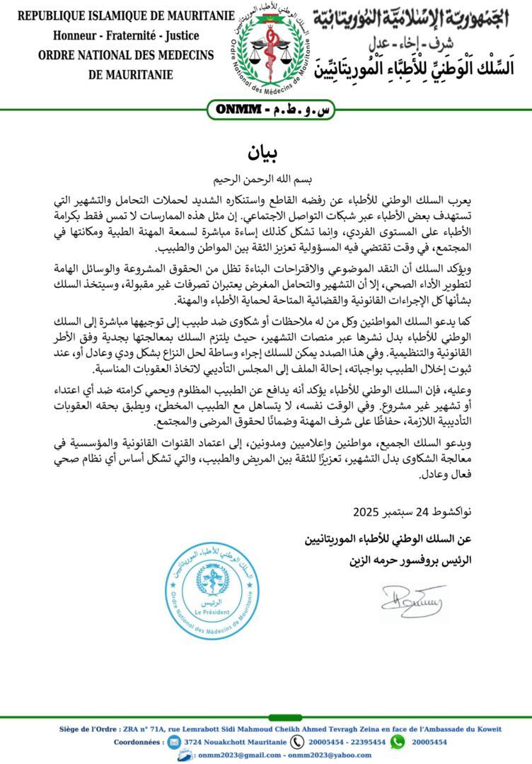ودعا السلك الوطني للأطباء الإعلاميين والمدونين إلى اعتماد القنوات القانونية والمؤسسية في معالجة الشكاوى بدل التشهير، تعزيزا للثقة بين المريض والطبيب، والتي تشكل أساس أي نظام صحي فعال وعادل.