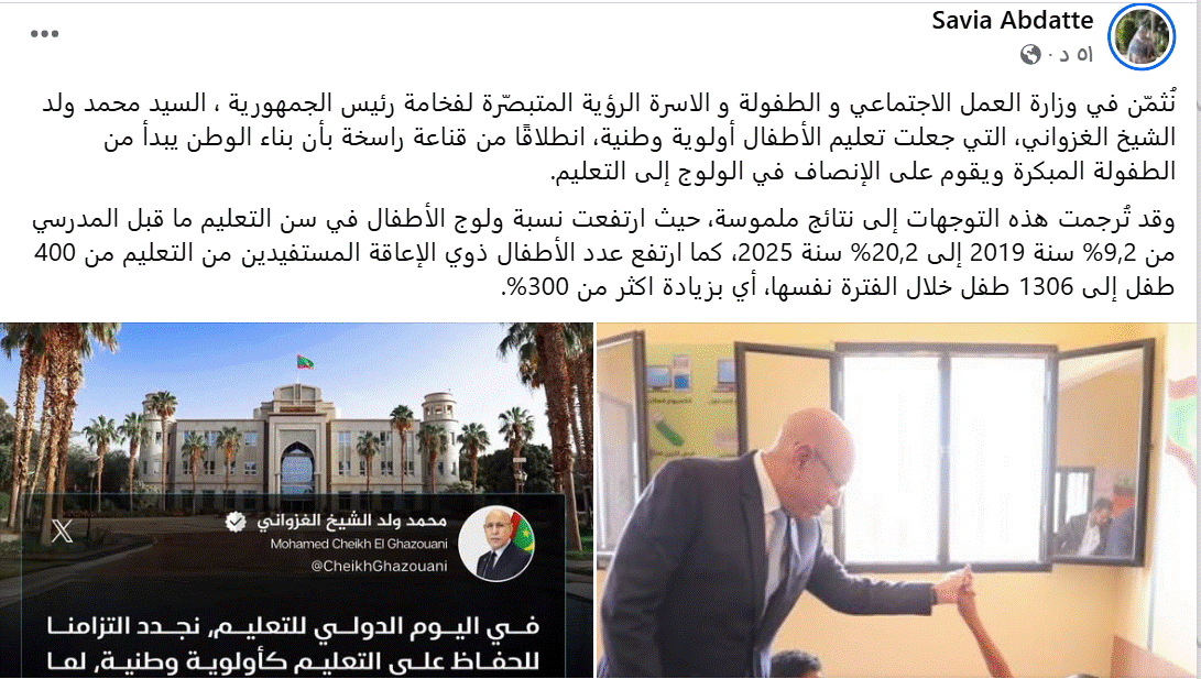 وأضافت أن تعليم الأطفال أولوية وطنية لدى الرئيس محمد ولد الغزواني "انطلاقًا من قناعة راسخة بأن بناء الوطن يبدأ من الطفولة المبكرة ويقوم على الإنصاف في الولوج إلى التعليم".