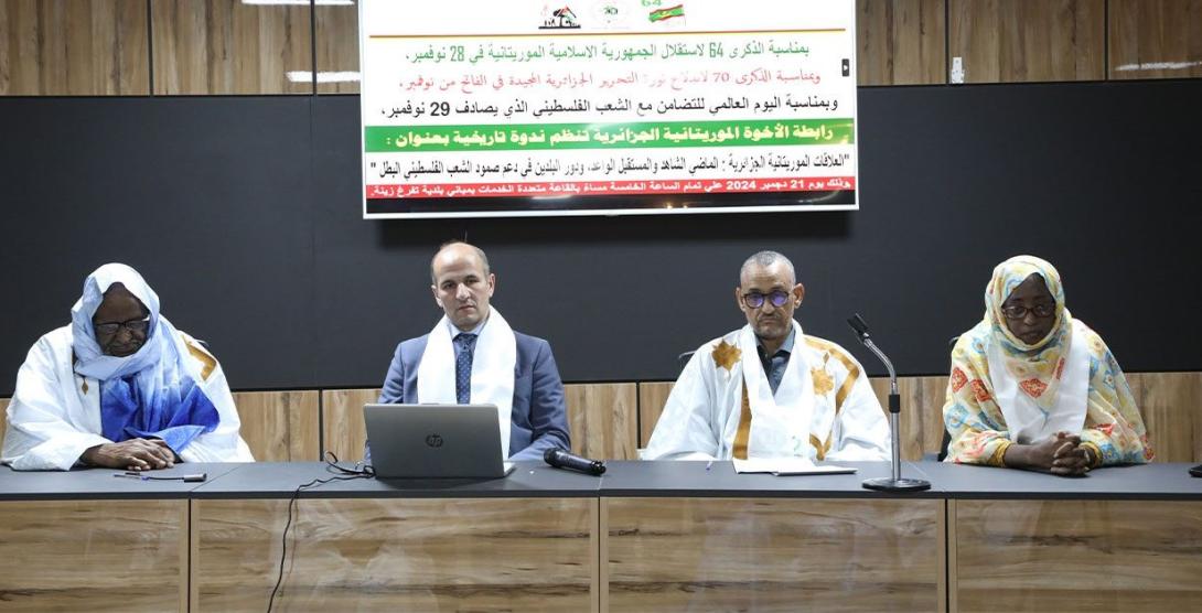 نظمت رابطة الأخوة الموريتانية الجزائرية، مساء السبت ندوة في نواكشوط، تحت عنوان: "العلاقات الموريتانية الجزائرية: الماضي الشاهد والمستقبل الواعد، ودور البلدين في دعم صمود الشعب الفلسطيني البطل".