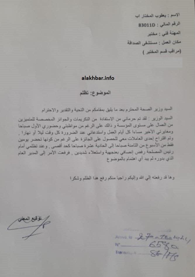 وقال ولد المختار وهو مراقب في قسم المختبر في المستشفى – في تظلم أرسله لوزير الصحة، ووصلت وكالة الأخبار المستقلة نسخة منه – إنه هو أول من يداوم صباحا، وآخر من يغادره مساء، ويتم استدعاؤه عند الضرورة أي وقت ليلا أو نهارا.