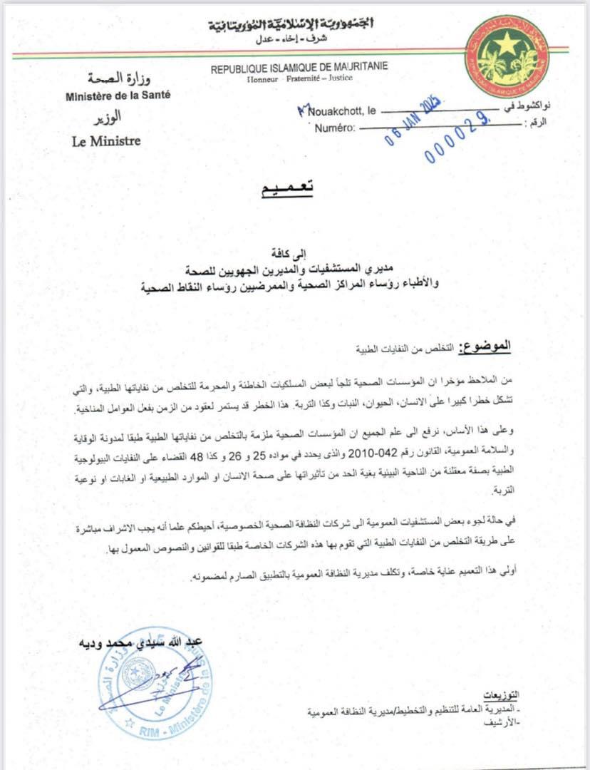 وألزم الوزير في تعميه المؤسسات الصحية “بالتخلص من نفاياتها الطبية طبقا لمدونة الوقاية والسلامة العمومية، القانون رقم 042-2010 والذى يحدد في مواده 25 و 26 وكذا 48 القضاء على النفايات البيولوجية الطبية بصفة معقلنة من الناحية البيئية بغية الحد من تأثيراتها على صحة الانسان أو الموارد الطبيعية أو الغابات أو نوعية التربة”.