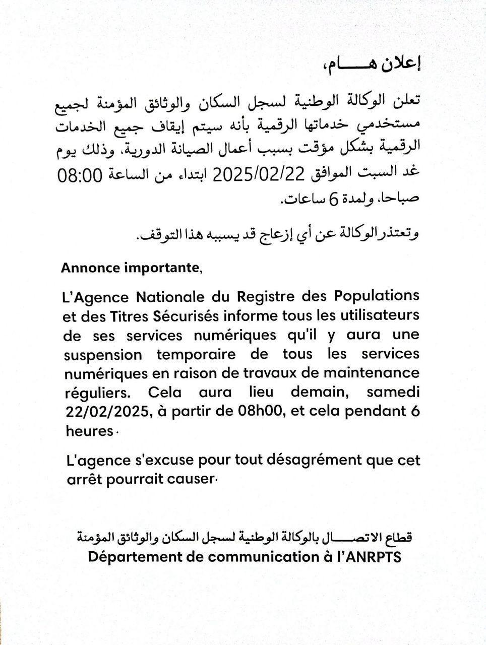 أعلنت الوكالة الوطنية لسجل السكان والوثائق المؤمنة عن توقف مؤقت لخدماتها الرقمية، ابتداءً من الساعة 08:00 من يوم السبت 22 فبراير، لمدة 6 ساعات.