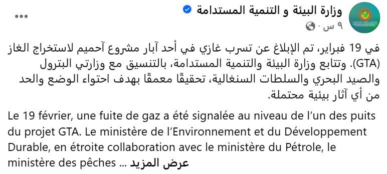 أعلنت وزارة البيئة والتنمية المستدامة عن فتح تحقيق في التسرب الذي أبلغ عنه بأحد آبار حقل "السلحفاة آحميم" المشترك مع السنغال.