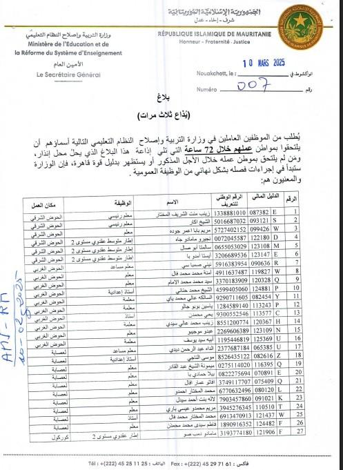 جاء ذلك في بلاغ اليوم الاثنين وقعه الأمين العام لوزارة التربية وإصلاح النظام التعليمي يحي بوب الطالب، والأمين العام لوزارة الثقافة والاتصال والعلاقات مع البرلمان سيدي محمد جدو خطري.