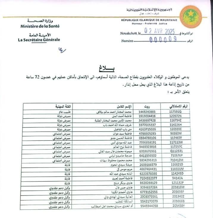 Apr 03 / التعليقات وزارة الصحة تطلب من الموظفين الالتحاق بأماكن عملهم خلال 72 ساعة بواسطة mohamed أصدرت وزارة الصحة بلاغا صباح اليوم موجه للموظفين والوكلاء العقدويين بقطاع الصحة التالية أسماؤهم إلى الالتحاق بأماكن عملهم في غضون 72 ساعةوبينت الوزارة أن البلاغ يحل محل إنذار وعلى الموظفين التالية أسمائهم الالتحاق بأماكن علمهم قبل المدة المقررة خميس, 2025/04/03 - 16:24