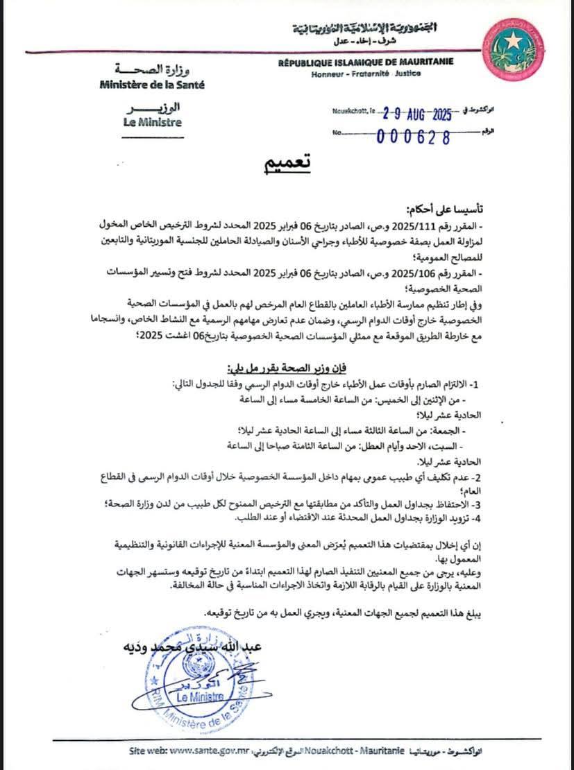 وألزمت الوزارة الأطباء العموميين بالاحتفاظ بجداول العمل والتأكد من مطابقتها مع الترخيص الممنوح لكل طبيب، داعية إلى تزويدها بجداول العمل المحدثة عند الاقتضاء أو عند الطلب.