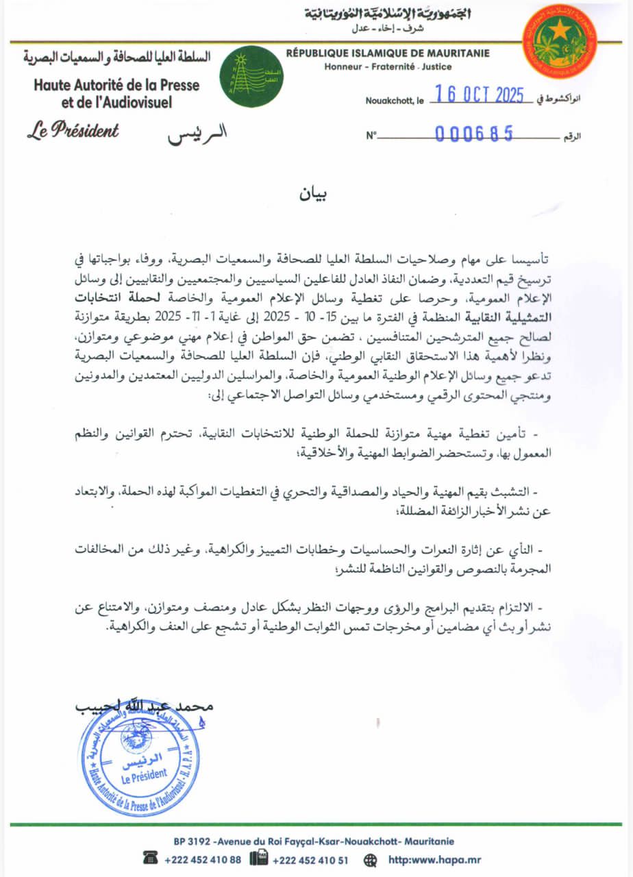 دعت السلطة العليا للصحافة والسمعيات البصرية "الهابا" وسائل الإعلام العمومية والخاصة إلى تغطية تنأى عن إثارة النعرات والحساسيات وخطابات التمييز والكراهية، وغير ذلك من المخالفات المُجرَّمة بالنصوص والقوانين الناظمة للنشر، في حملة انتخابات التمثيلية النقابية.