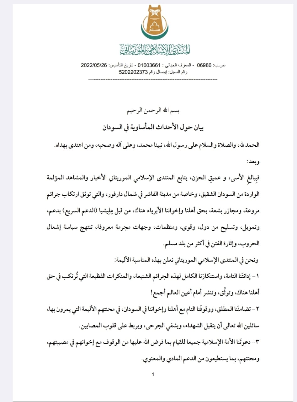 أعلن المنتدى الإسلامي الموريتاني تضامنَه ووقوفَه التام مع أهل السودان، في محنتهم التي يمرون بها، داعيا الأمة الإسلامية للقيام بما فرض الله عليها من الوقوف مع إخوانهم في مصيبتهم، وبما يستطيعون من الدعم المادي والمعنوي.