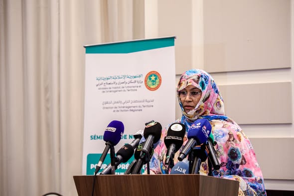 وتابعت معالي الوزيرة: أشرف القطاع، بالشراكة الوثيقة مع وزارة الدفاع الوطني ممثلة في المديرية العسكرية للجغرافيا بالأركان العامة للجيوش، على تنفيذ سلسلة من الخطوات الفنية والمؤسسية. ففي 23 مايو 2024، وتحت الرعاية السامية لصاحب الفخامة رئيس الجمهورية، أطلقت الحكومة أولى الخطوات الرسمية لإنجاز المخطط الوطني للاستصلاح الترابي، ليبدأ العمل الميداني المكثف من جمع المعطيات وتحليلها وتشخيصها، مرورًا بالورشات الفنية، واجتماعات اللجان الوزارية، والملتقيات الجهوية التي نُظمت في الأقطاب الجهوية الثلاثة الكبرى، وتحديدًا في النعمة، وألاك، ثم أزويرات، بحضور الولاة، والمنتخبين، والخبراء، وممثلي المجتمع المدني في جميع ولايات الوطن.