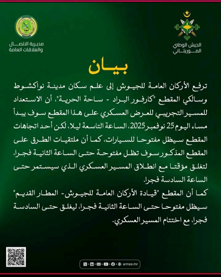 كما سيظل المقطع الرابط بين "قيادة الأركان العامة للجيوش - المطار القديم" مفتوحا حتى الساعة الثانية فجرا٫ ليغلق بعد ذلك حتى الساعة السادسة صباحا مع انتهاء المسير العسكري.