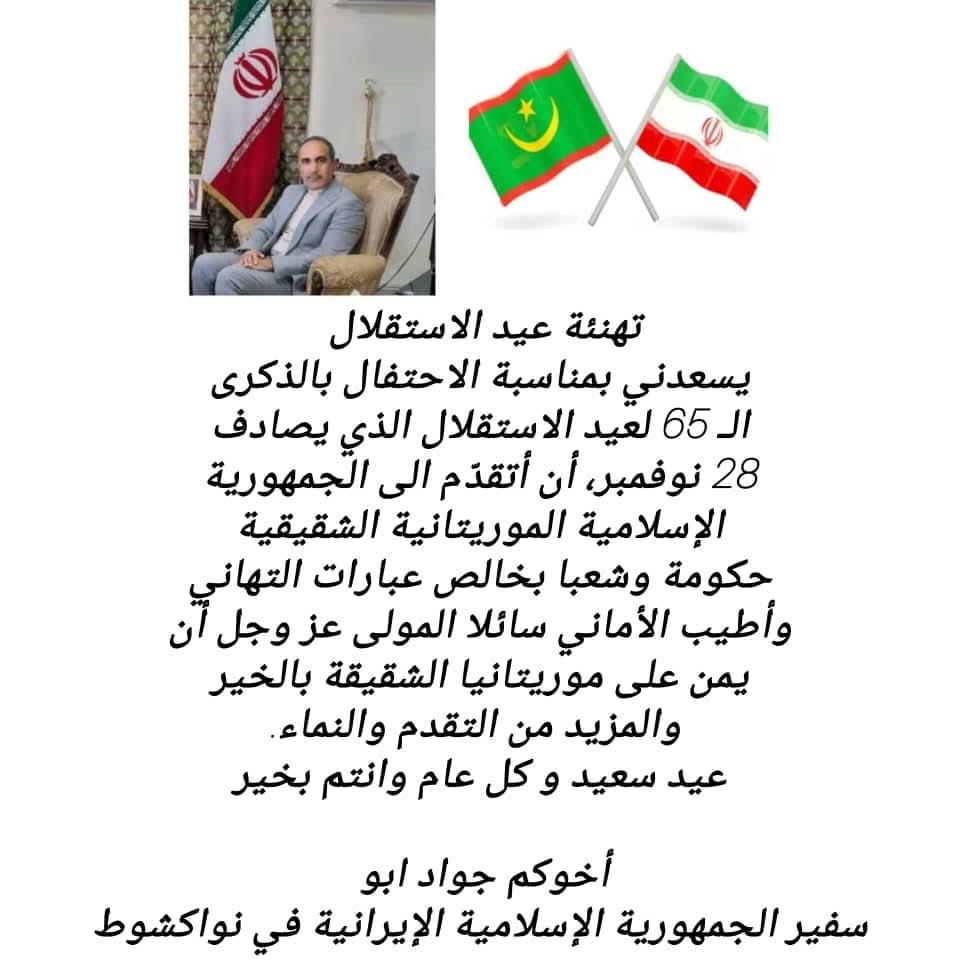 أعربت سفارة الجمهوریةِ الإسلامیةِ الإیرانیةِ في موریتانیا عن تهانيها لموريتانيا قيادة وشعبا بمناسية الذكرى ال65 لعيد الاستقلال الوطني.