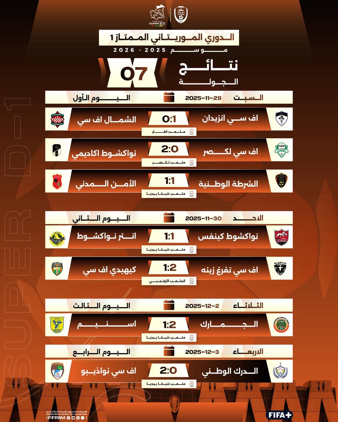 وحقق اف سي نواذيبو فوزا مهما على الدرك الوطني بهدفين نظيفين، سجلهما عبد الله محمود وكارتيير ديمبيلي، ملحقا أول خسارة بالدرك هذا الموسم.